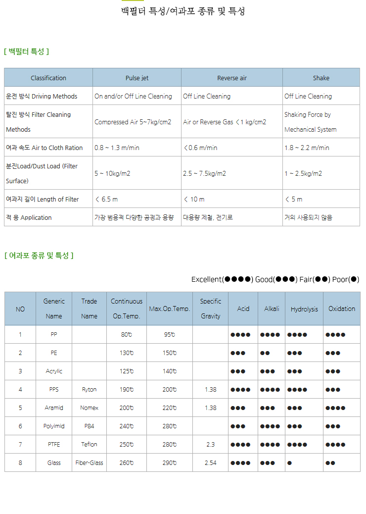 백필터특성/여과포종류 및 특성